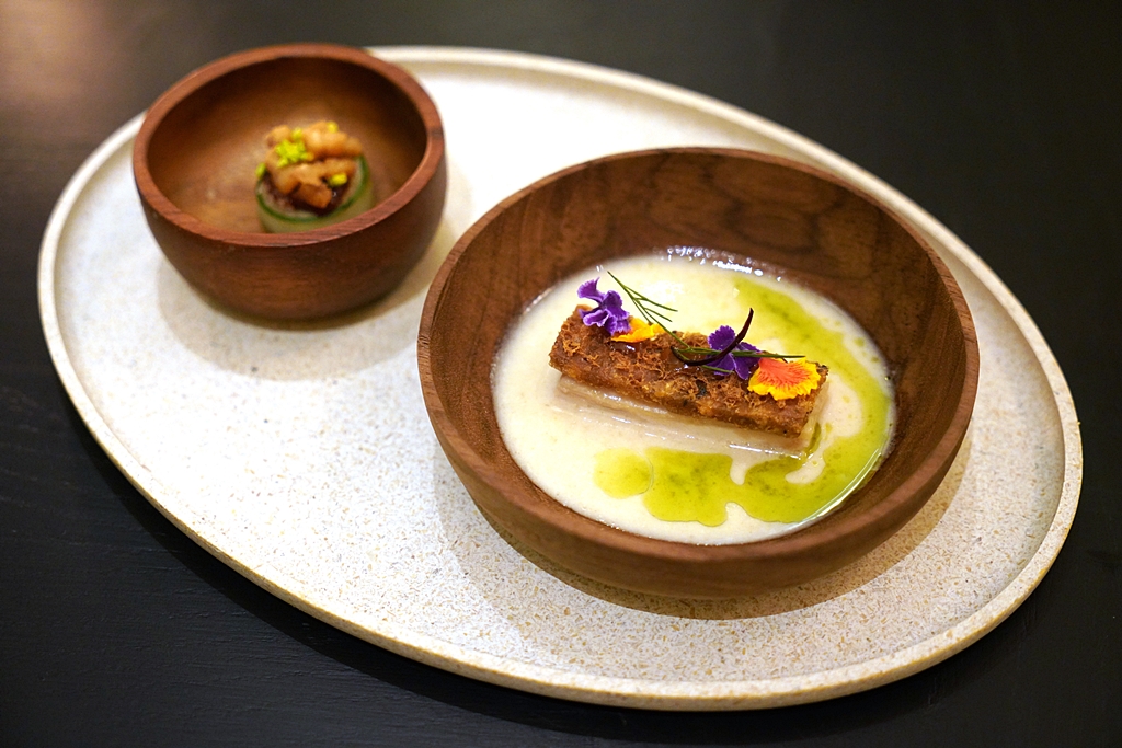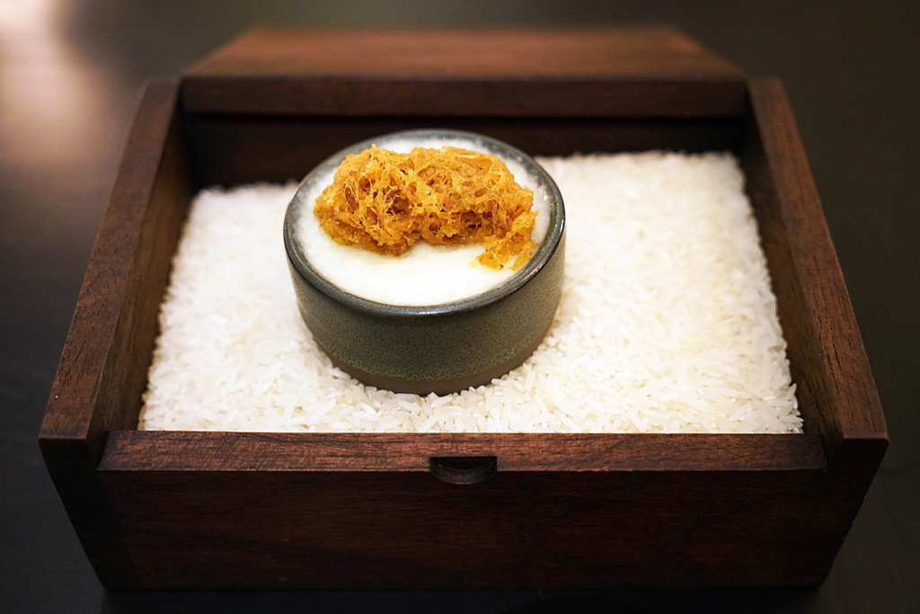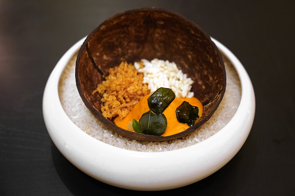 5th course: Tom Kah Gai, Fried Shrimp | Fried Chili Relish | Crispy Pork Fat [16/20] – ต้มข่าไก่ที่มาพร้อมกับเนื้อไก่หน้ากุ้งแพซอสน้ำปลาหวานที่เลียนแบบหน้าตาให้เหมือนกับหมูกรอบเสิร์ฟคู่กับข้าวหน้าน้ำพริกกากหมู เมนูนี้ถือเป็นจานเด็ดประจำมื้อได้เลย