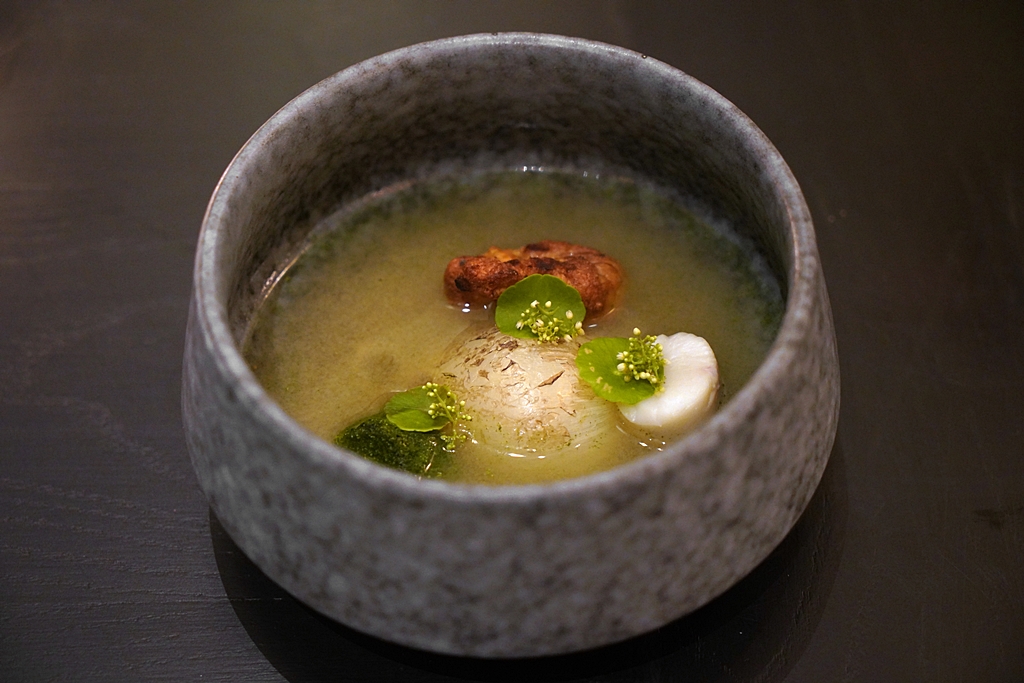7th course: Roe Roe Roe Your Tomyam [14/20] – ซุปต้มยำน้ำใสทานคู่กับไข่ปลา 4 อย่าง ได้แก่ ไข่ปลาริวกิว ไข่ปลากระพง ไข่ปลาสลิดและไข่ปลาหมึก เมนูนี้เป็นอีกเมนูที่น่าสนใจสำหรับคนที่ไม่เคยทานไข่ปลาบางชนิด น้ำซุปต้มยำดีงาม