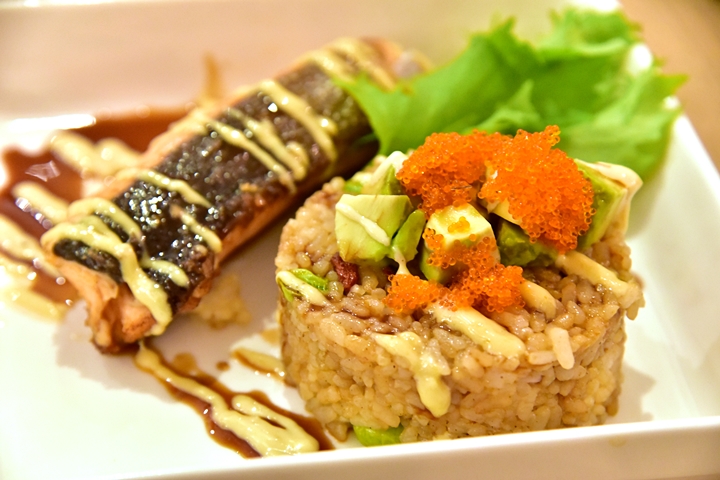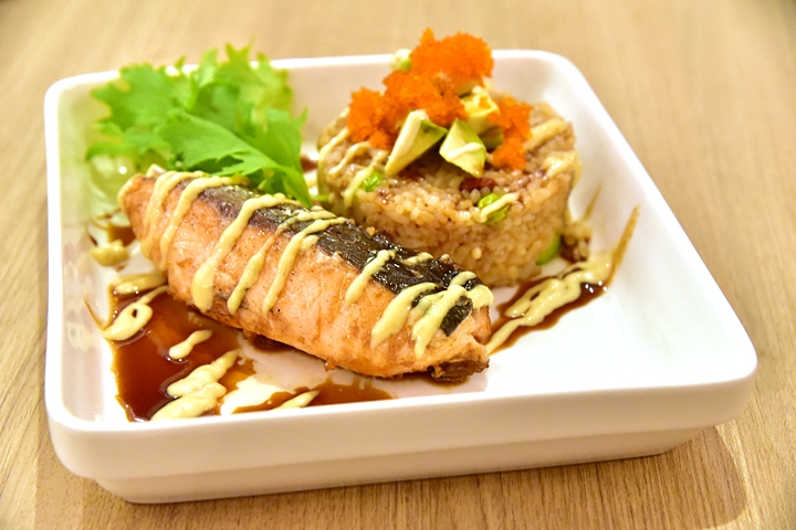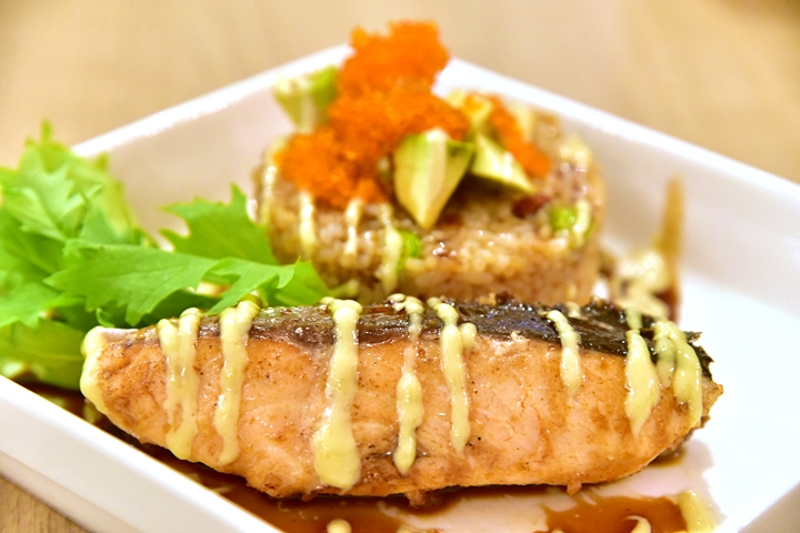 2. Avocado Salmon Fried Rice (295++ THB) – ข้าวผัดกระเทียมโรยหน้าด้วยไข่กุ้งกับอโวคาโดเสิร์ฟคู่กับแซลม่อนย่างราดซอสวาซาบิและเทริยากิส้มยูสุ