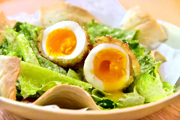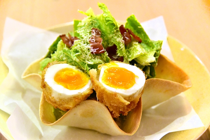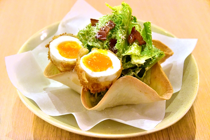 1. Caesar Salad (225++ THB) – ซีซาร์สลัดรสเยี่ยมเสิร์ฟในแป้งตอติญ่ากรอบคู่กับไข่ยางมะตูมทอด