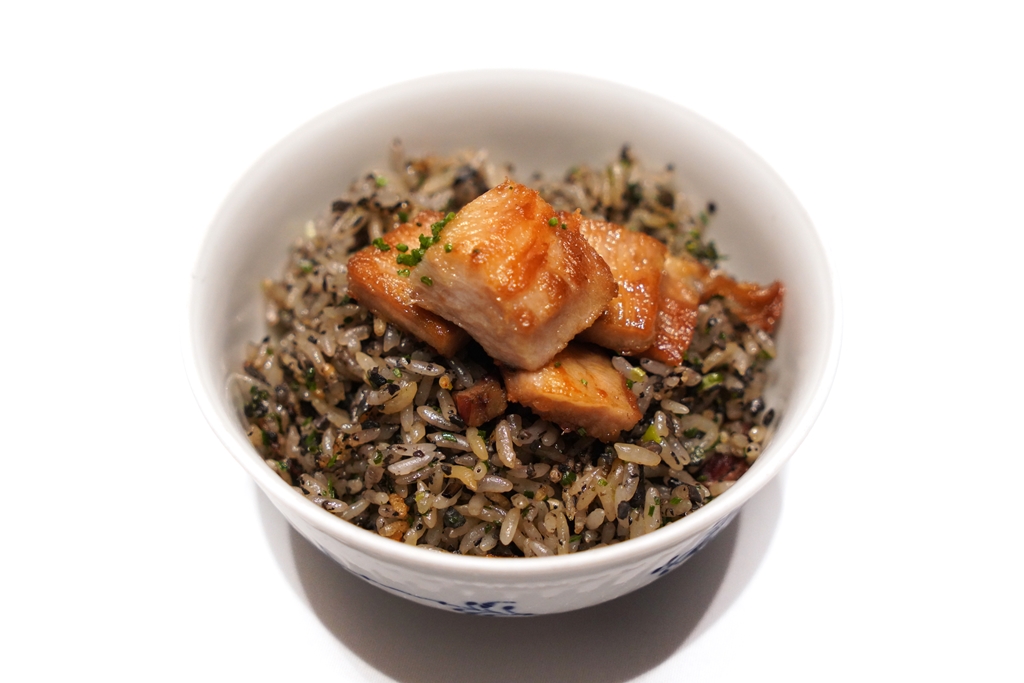 7th course : Braised Rice with Fresh Gangba Mushroom and Pork [17/20] – ข้าวอบหม้อดินที่คลุกเคล้ากับเห็ดสีดำหายากที่มีกลิ่นหอมละมุนเสิร์ฟคู่กับคอหมูย่างและผัดบวบกับหอยตลับ