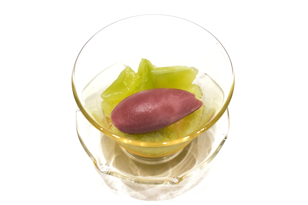 8th course : Seasonal Fruit Dessert [15/20] – ขนมหวานที่เลือกจากผลไม้ตามฤดูกาลที่ผมเลือกเป็นองุ่นที่ได้เป็นไอศกรีมองุ่นแดงเสิร์ฟคู่กับกรานิต้าองุ่นเขียวไชน์มัสแคตและเจลลี่ชา