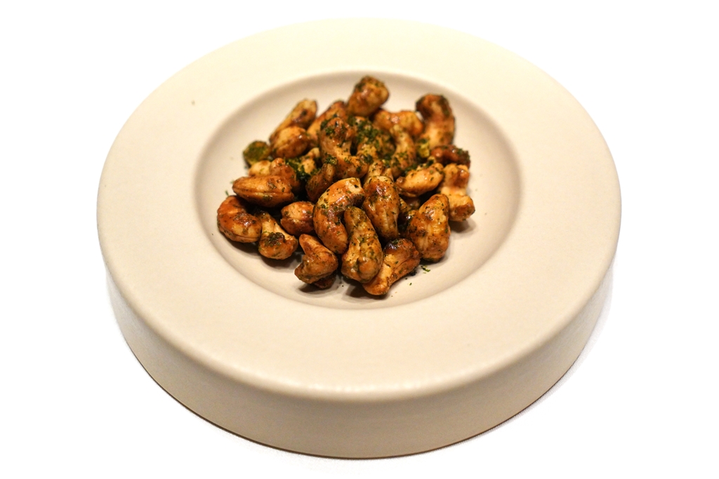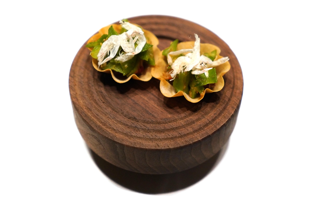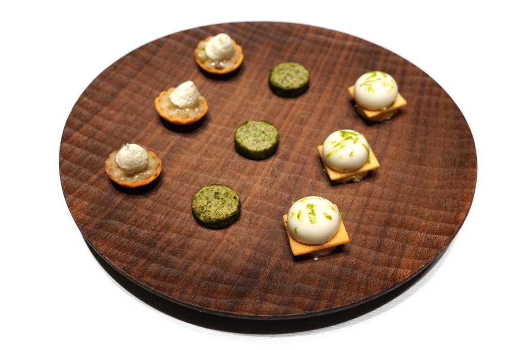 Amuse Bouche [15/20] – เมนูทานเล่นที่ประกอบไปด้วยเม็ดมะม่วงหิมพานต์อบสาหร่าย ผักดองและทาร์ตถั่วพลูกุ้งแห้งซอสเอ็กซ์โอ